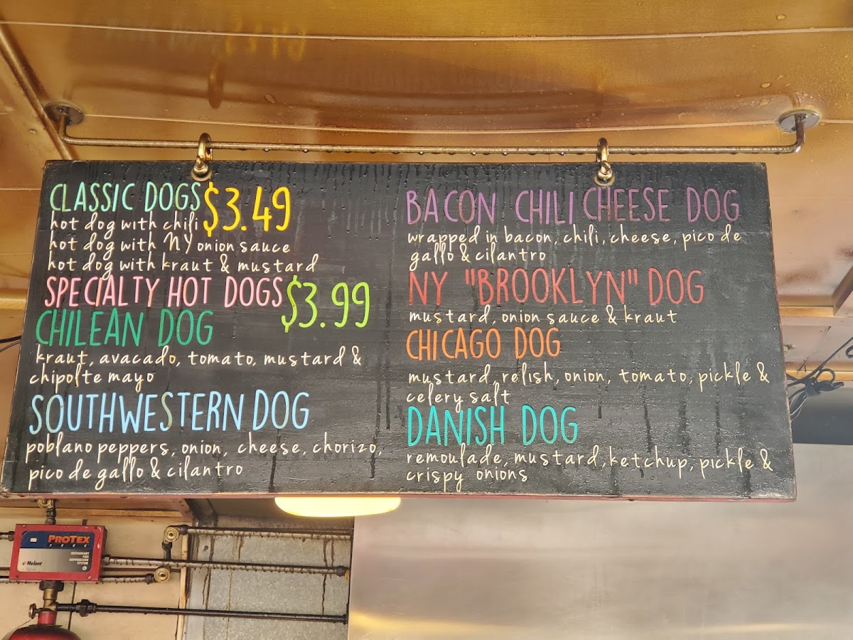 Danish Dog: Topped with remoulade, mustard, ketchup, pickle, and crispy onions.